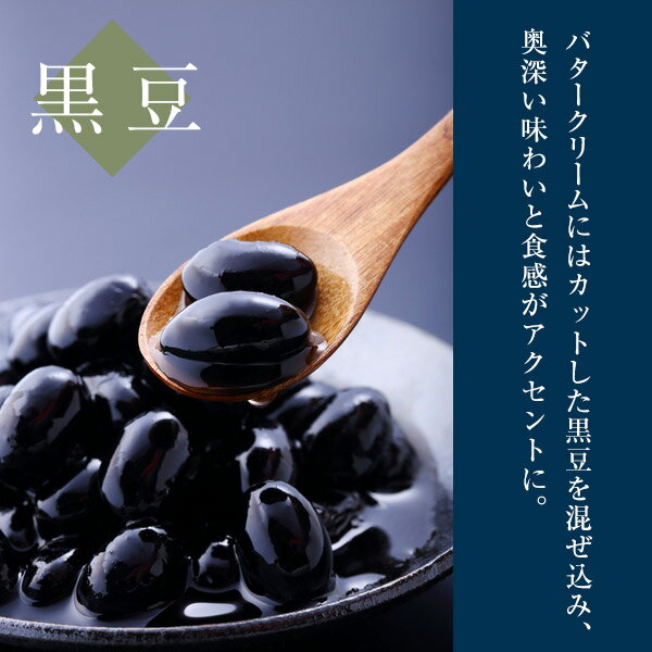 ふっくら炊き上げた黒豆をカットしました 北海道産「黒豆(かのこ豆)」をほんのり甘く炊き上げカットし、 バタークリームに混ぜ込みました。