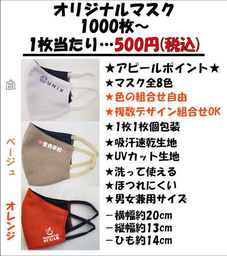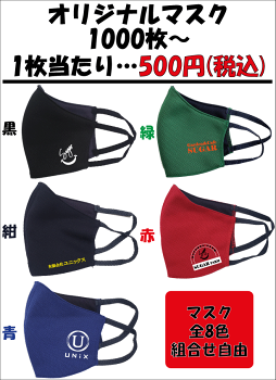 1000枚以上のオリジナルマスク作成で、お買い得価格始めました^^会社や部活動、クラブチームやサークルのみんなで、マスクの色選び放題、複数のデザインも合わせての合計枚数でもOK^^必要であれば見積書・納品書・請求書・領収書発行致します。