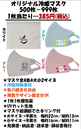 500枚以上のオリジナルマスク作成で、お買い得価格始めました^^会社や部活動、クラブチームやサークルのみんなで、マスクの色選び放題、複数のデザインも合わせての合計枚数でもOK^^必要であれば見積書・納品書・請求書・領収書発行致します。