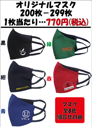 200枚以上のオリジナルマスク作成で、お買い得価格始めました^^会社や部活動、クラブチームやサークルのみんなで、マスクの色選び放題、複数のデザインも合わせての合計枚数でもOK^^必要であれば見積書・納品書・請求書・領収書発行致します。