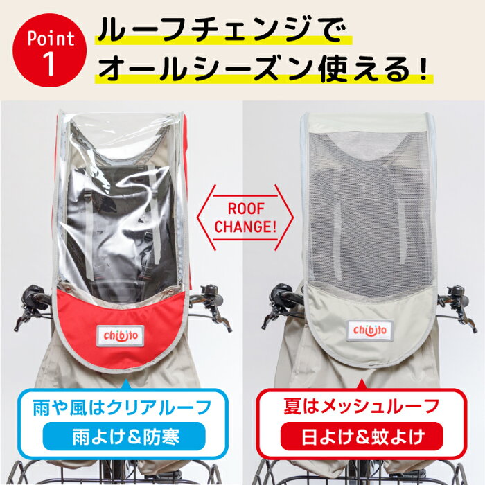 やり方はカンタン!ファスナーで付け替えるだけ ルーフ全体が外れるので、レイン⇔メッシュと簡単に衣替えできます。